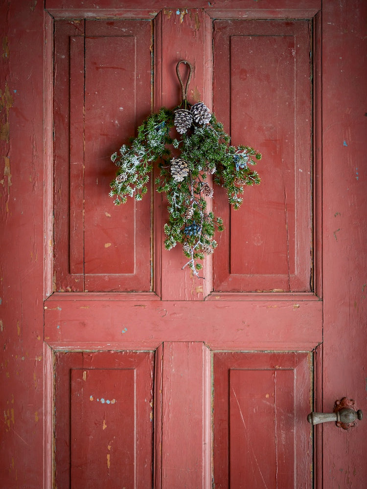 Deze tijdloze deurversiering verwelkomt je gasten met de warme sfeer van traditionele kerstmagie.