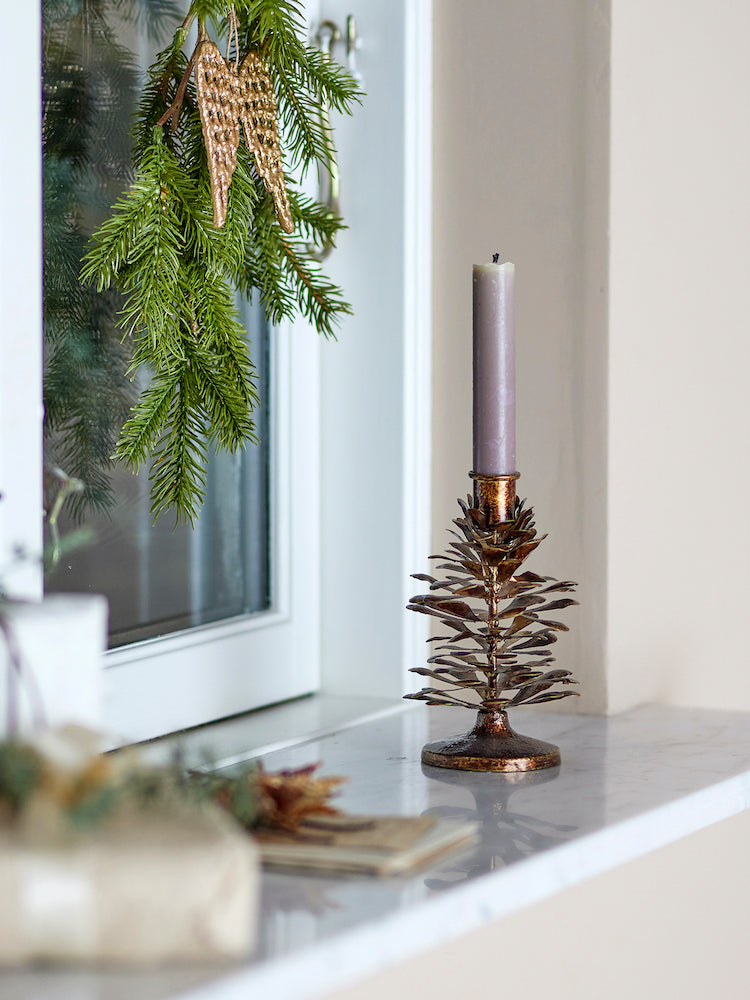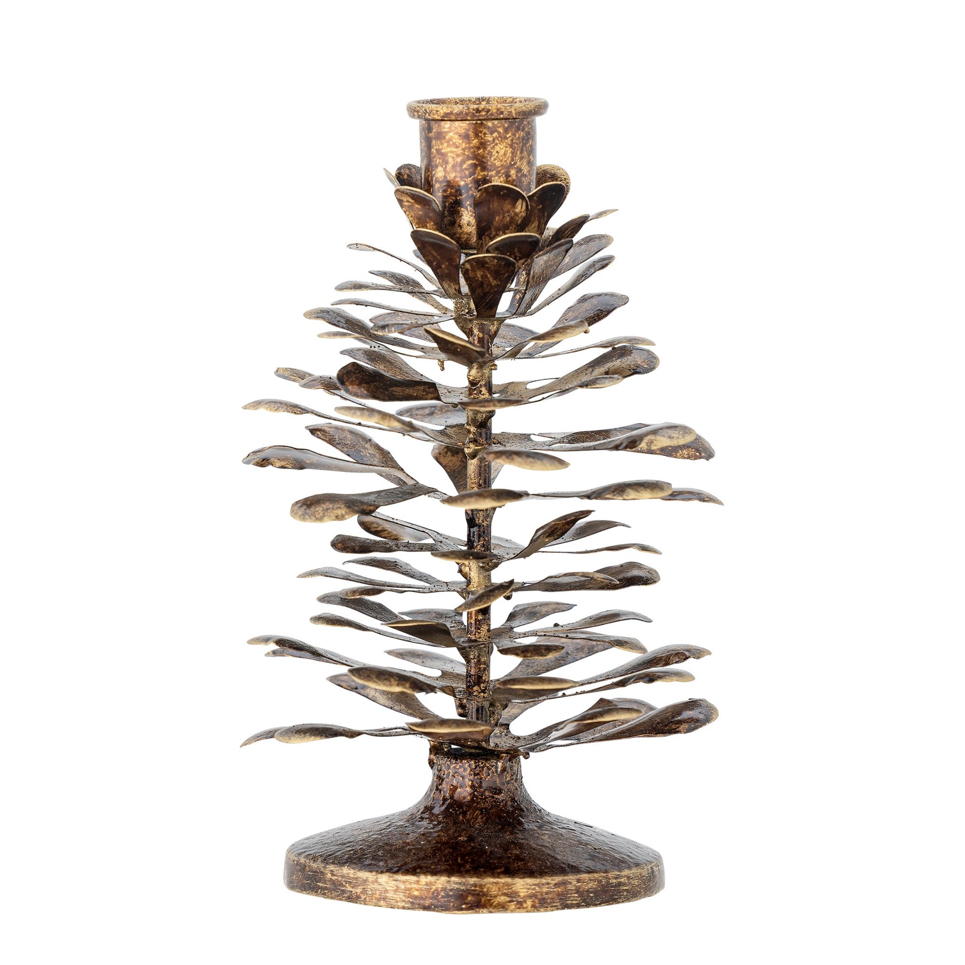 Deze elegante kandelaar, vakkundig vervaardigd uit hoogwaardig metaal met een luxueuze gouden afwerking, is geïnspireerd op de natuurlijke schoonheid van een dennenappel en benadrukt elk verfijnd detail van deze iconische vorm.